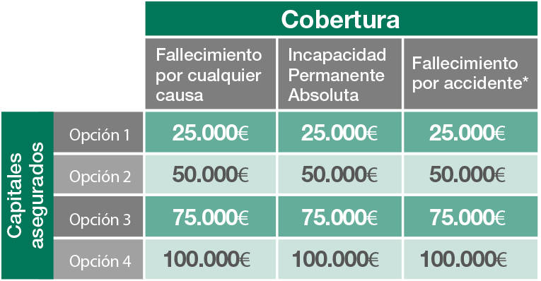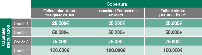 * En caso de Fallecimiento por accidente, los capitales a percibir serán el doble capital asegurado: 50.000€, 100.000€, 150.000€ o 200.000€ para la Opción 1, 2, 3 ó 4 respectivamente.